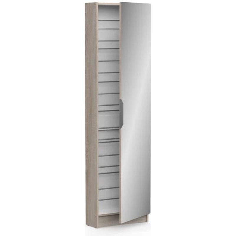 Armoire a chaussures ZAPATERO - 12 Paires - Décor Chene brossé - 1 porte avec miroir - L50 x P20 x H180,5 cm - CBA MEUBLES