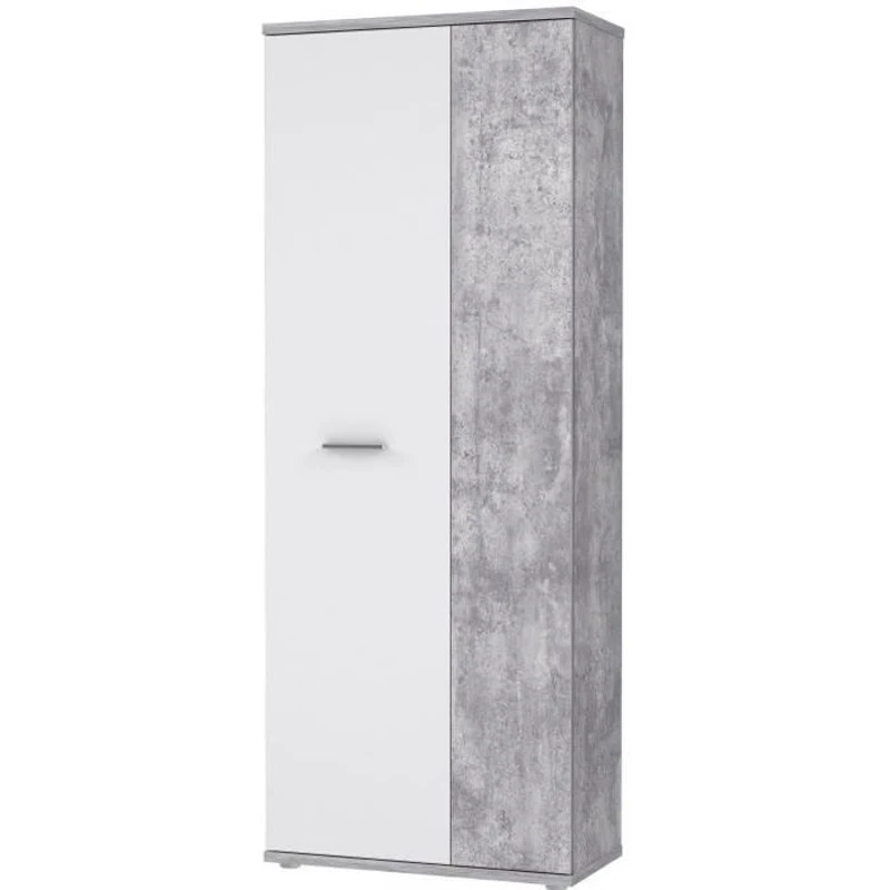Armoire a chaussures en panneaux de particules effet béton et blanc mat. Style et design contemporain avec 2 portes et 5 tablettes. Fabrication européenne. Dimensions totales : L 68,9 x P 34,8 x H 179,1 cm.