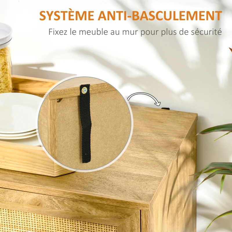 HOMCOM Buffet de rangement placard de cuisine commode 3 portes avec étagères porte cannage style bohème - 150 x 39,5 x 79 cm