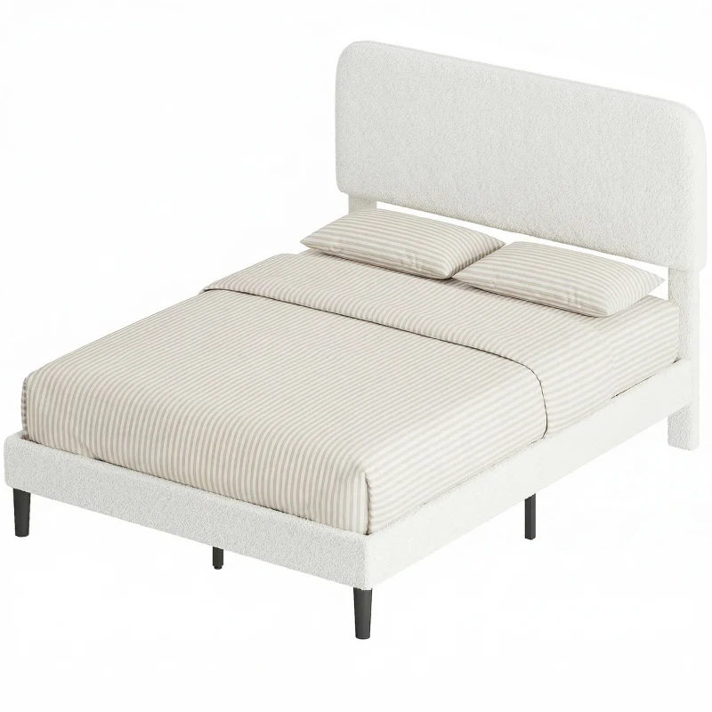 HOMCOM Cadre de Lit 140x190cm avec Sommier, Tête de Lit Réglable, Lit Double Rembourré en Velours Teddy, Lattes en Métal, Blanc