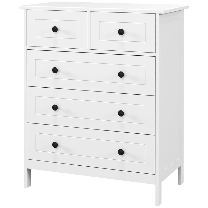 HOMCOM Commode meuble de rangement 5 tiroirs pour chambre, bureau, entrée, blanc et poignée métal noir