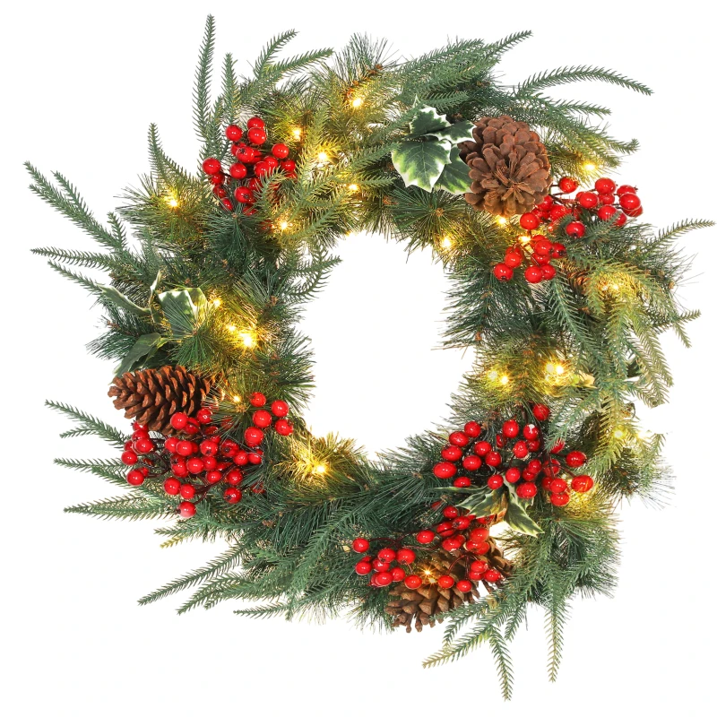 HOMCOM Couronne de Noël lumineuse 60 cm avec 35 LED, minuterie, 170 pointes, pommes de pin, baies, feuilles de houx, vert