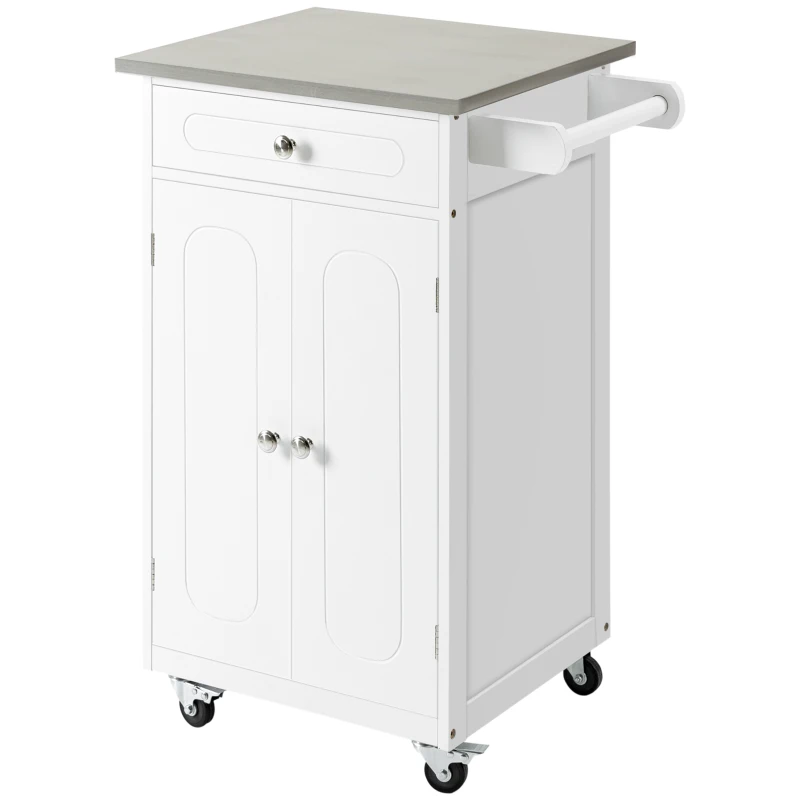 HOMCOM Chariot de service desserte de cuisine à roulettes multi-rangements 1 tiroir placard 2 portes avec étagère porte-torchons MDF blanc acier inoxydable