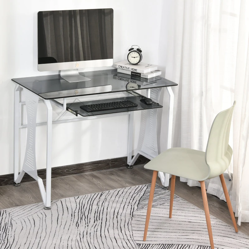 HOMCOM Table Informatique Bureau pour Ordinateur avec Clavier Coulissant Plateau Verre Trempé 100 x 54,5 x 75 cm Gris et Blanc