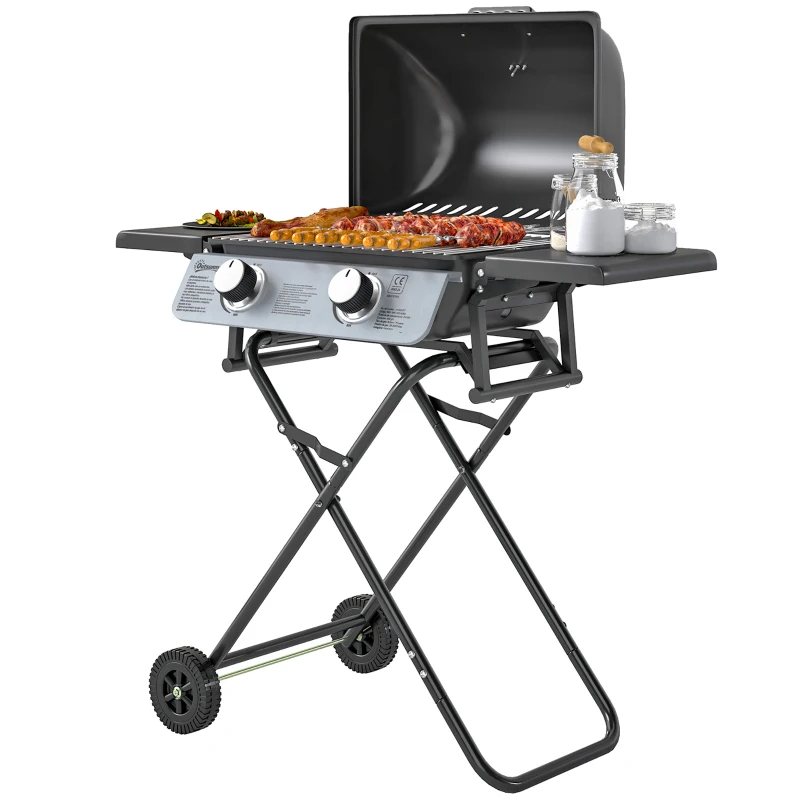 Outsunny Barbecue gaz transportable, 2 brûleurs 5,6 kW, barbecue gaz de camping avec étagères latérales thermomètre et roues, noir