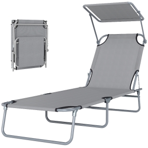 Outsunny Bain de soleil chaise longue pliante avec appuie-tête, transat inclinable en aluminium et textilène, transat jardin extérieur pour plage relax camping piscine terrasse, 165x60x76cm, gris