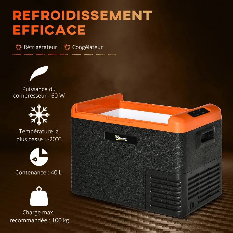 Outsunny Glacière électrique 40L portable, réfrigérateur congélateur avec poignées - dim. 58,7L x 36,5l x 43,8H cm orange et noir