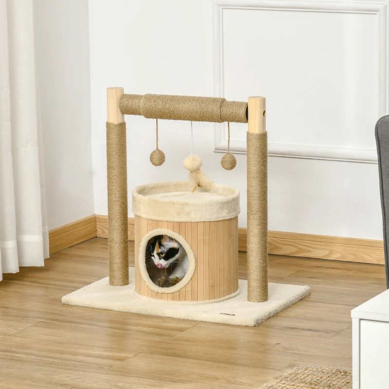 PawHut Arbre à chat niche maison pour chat cabane chat griffoirs grattoir jute jeu boules suspendues plateforme ronde dim. 60L x 40l x 60H cm - beige