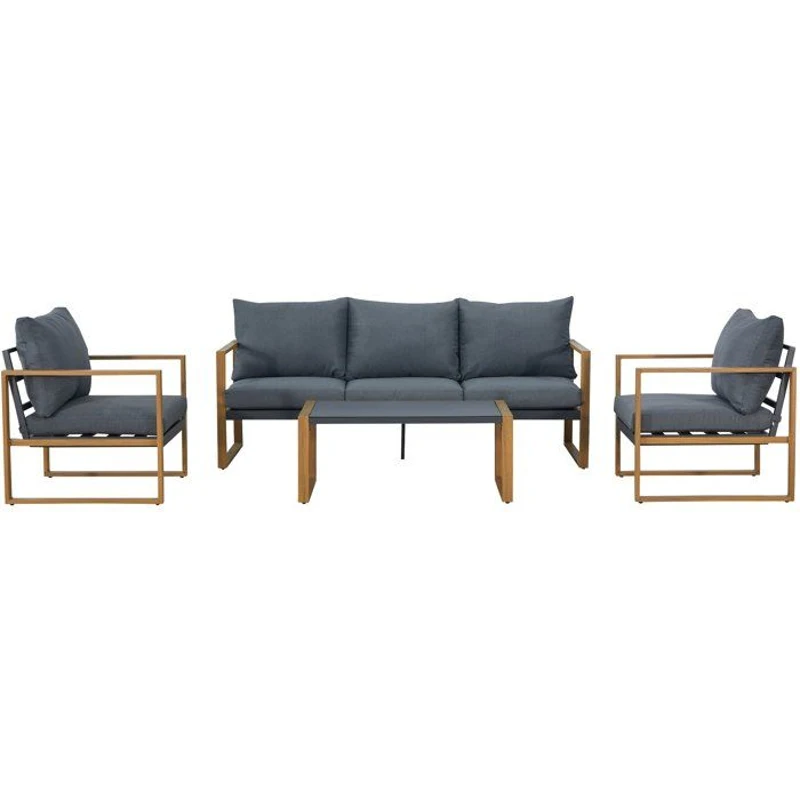 Salon bas de jardin en aluminium effet bois avec coussins - 5 personnes - PUERTO - Gris