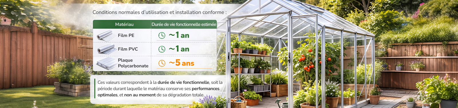 Les composants structurels constituent la base mécanique de la serre : cadres en acier; profilés en aluminium; traverses et éléments porteurs; fondations. Dans des conditions normales d’utilisation : structures de serres tunnel : environ 2 ans; serres de jardin : environ 2 ans; structures rigides (ex. polycarbonate) : environ 5 ans. Ces valeurs correspondent à des conditions d’utilisation domestiques ou semi-professionnelles.